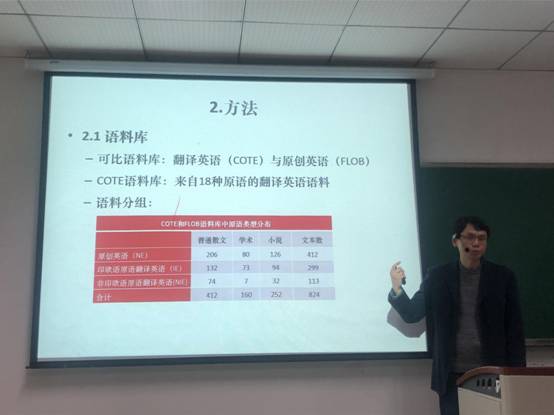 接着,胡显耀教授针对翻译共性和原语干扰提出了相关问题,引出语料库,文体特征和统计分析三种方法的详细介绍。接着指出原语的干扰包括简化特征、显化特征、语法显化、句段长度等方面。以翻译英语为例,印欧语系原语与非印欧语系原语作对比可以得出结论:印欧语系原语的翻译英语与原创英语差异比非印欧语原语的差异更为显著。