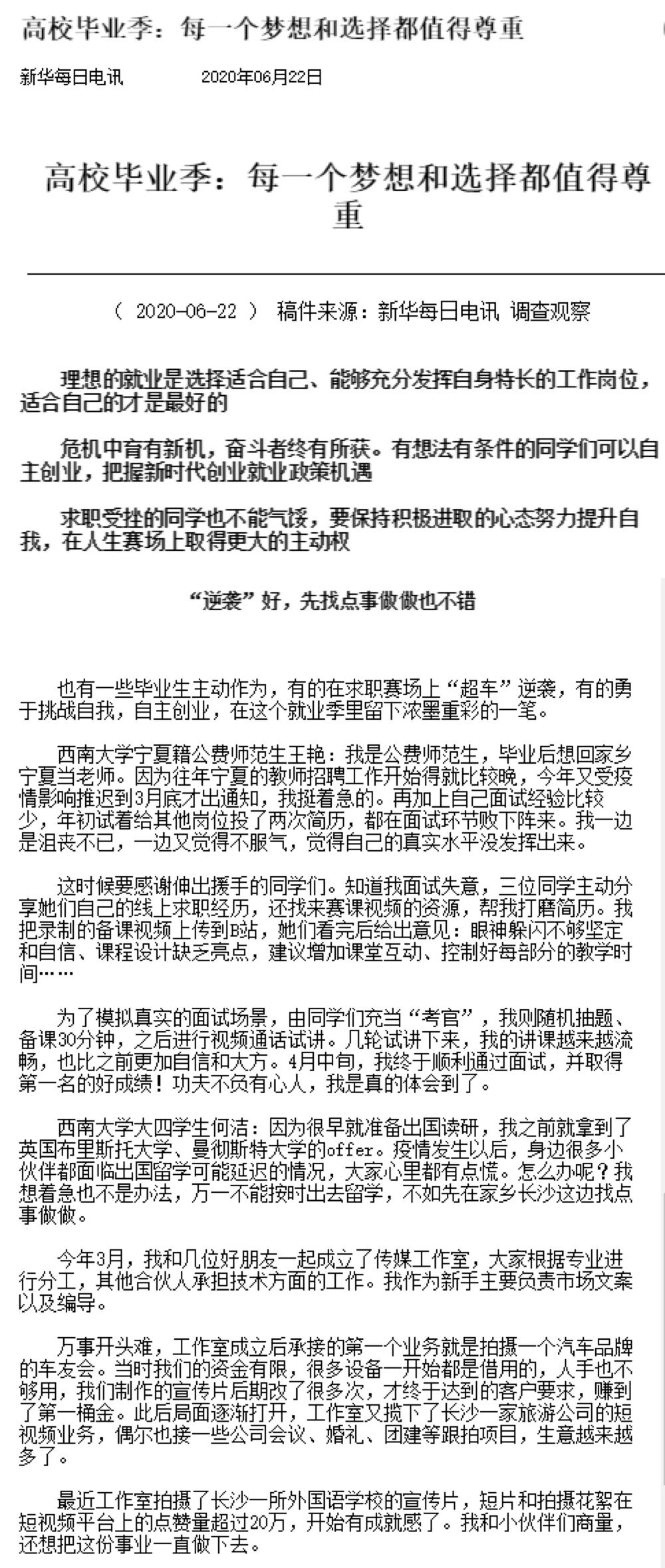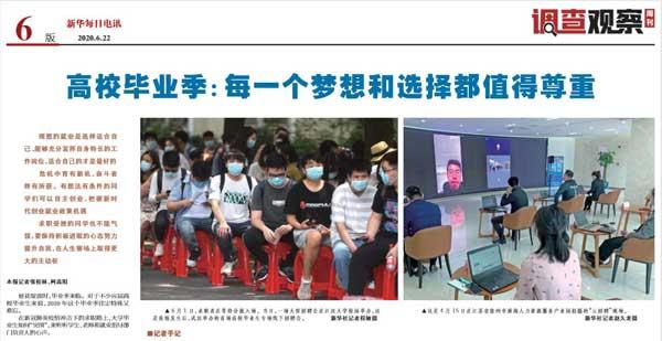 疫情期间,全院上下齐心协力拓展就业“云渠道”、推进就业“云帮扶”、创新就业“云服务”、主动进行“云推荐”,抓实抓细为毕业生提供扎实有效的帮助。通过“云就业”工作体系各项工作开展,学院就业工作取得了一定成效,2020届2名毕业生疫情期间就业成功案例获新华每日电讯报道。