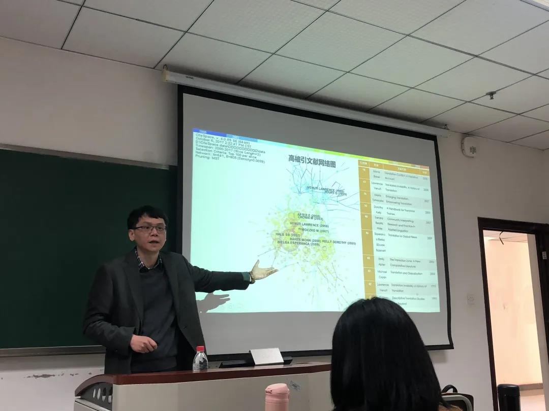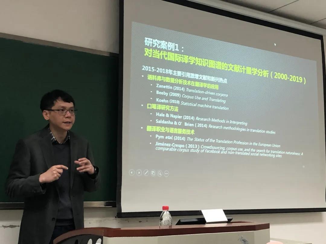 接着,胡教授通过两个真实的案例研究展现如何利用与学科相关的外部数据和内部数据,如何用文献计量学的方法了解学科的知识结构和文体统计学的方法分析语言和翻译现象背后的规律。第一个案例是“当代国际译学知识图谱的文献计量学分析(2000-2019)”。在案例中,他介绍了关键词分析和核心文献选取标准。第二个案例是“翻译英语变体的文体统计学分析”,胡教授通过语料库的文体统计学方法分析翻译语言与原创语言的语言特征,并在此基础上检验二者是否具有系统性显著差异。