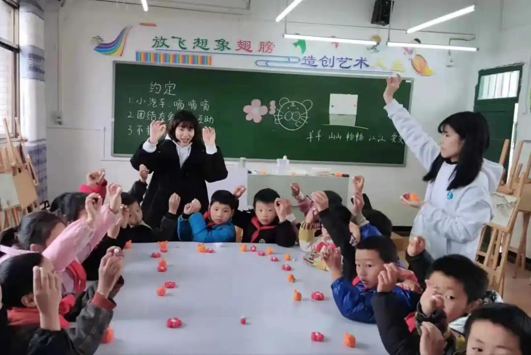 支教队员2021级外国语言学及应用语言学专业张炀带领学生用黏土制作老虎、小红花和蛋糕等模型。对于黏土手工,小朋友们表现出浓厚的兴趣,积极参与制作,课堂气氛轻松活跃。“我们组的作品最好看!”小朋友们手捧自己的作品,骄傲地向支教队员们展示着。趣味手工课以润物无声的方式启迪孩子们的思想,让孩子们体验到了创造的价值和乐趣。