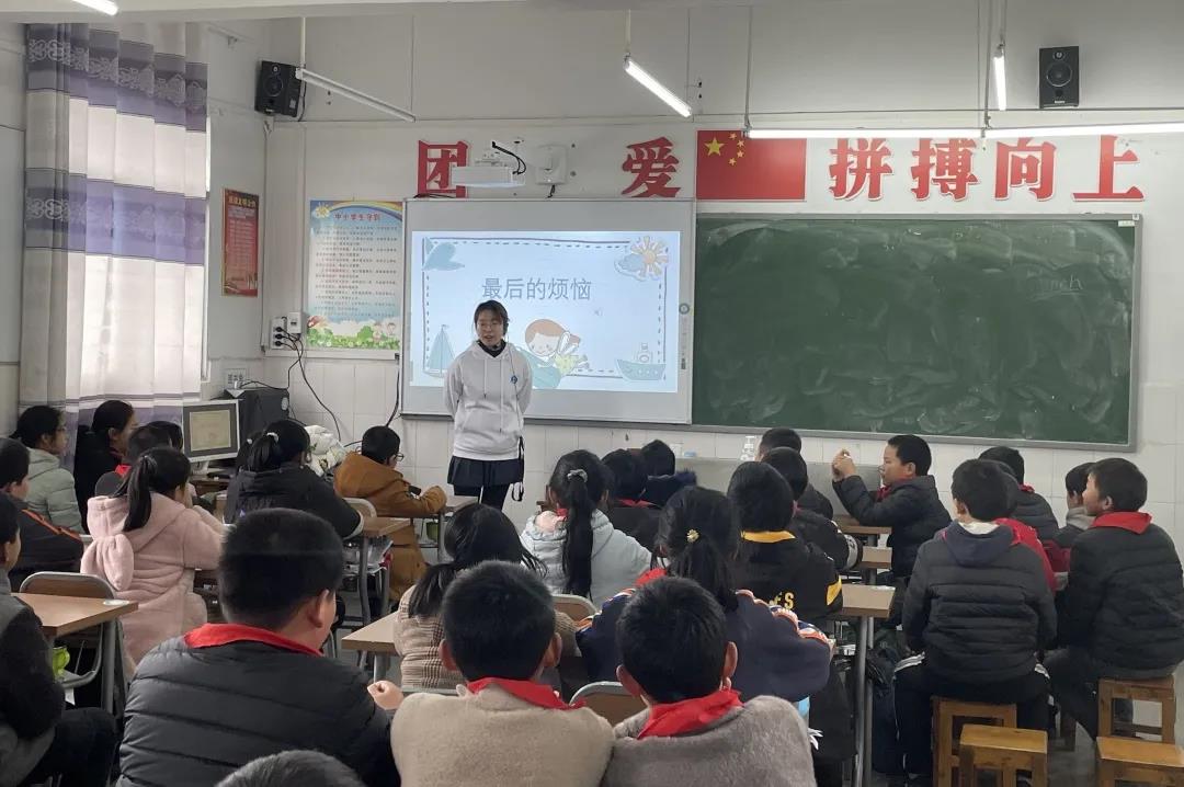 支教队员2021级英语语言文学专业李静雯的心理健康课以一首《童年》打开孩子们的心扉,通过讲述自己的身边事循循鼓励孩子们诉说自己的烦恼。随后,李老师与孩子们共同探讨并分享处理烦恼的经验,在一片欢声笑语中引导孩子们乐观面对生活,积极迎向未来。在心理健康课的最后,随着《幸福拍手歌》的响起,孩子们用热情欢快的掌声展示了对这次课堂的喜爱。