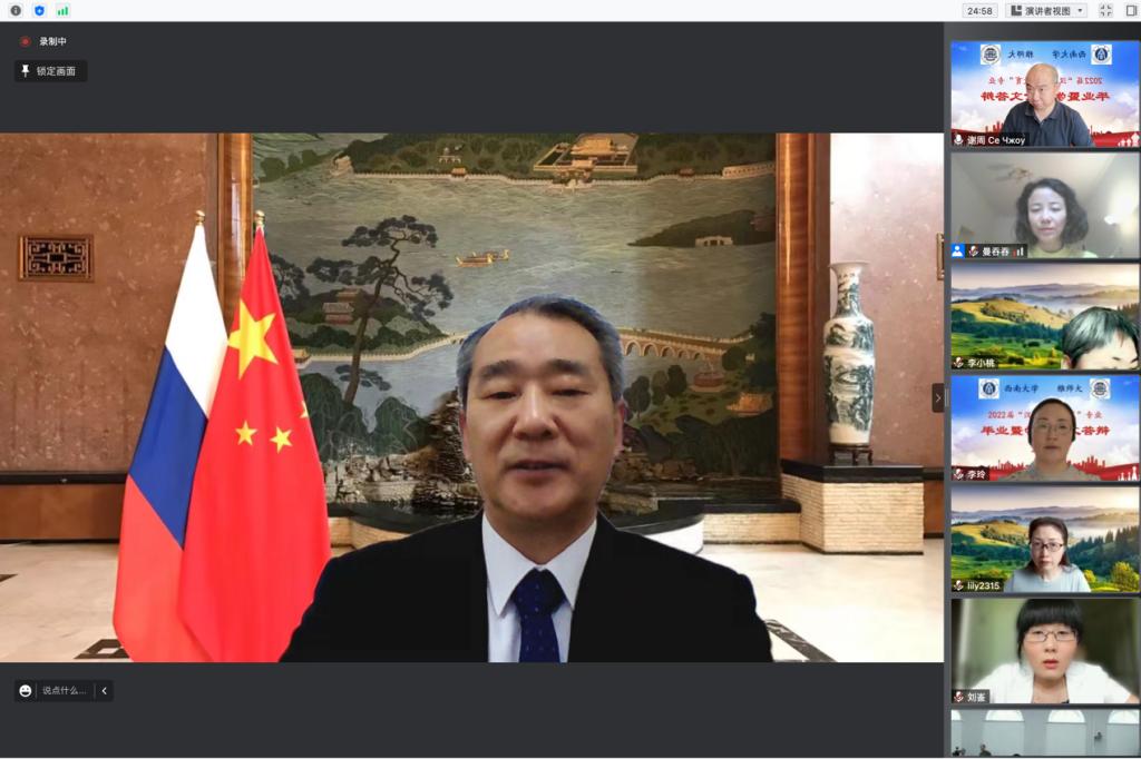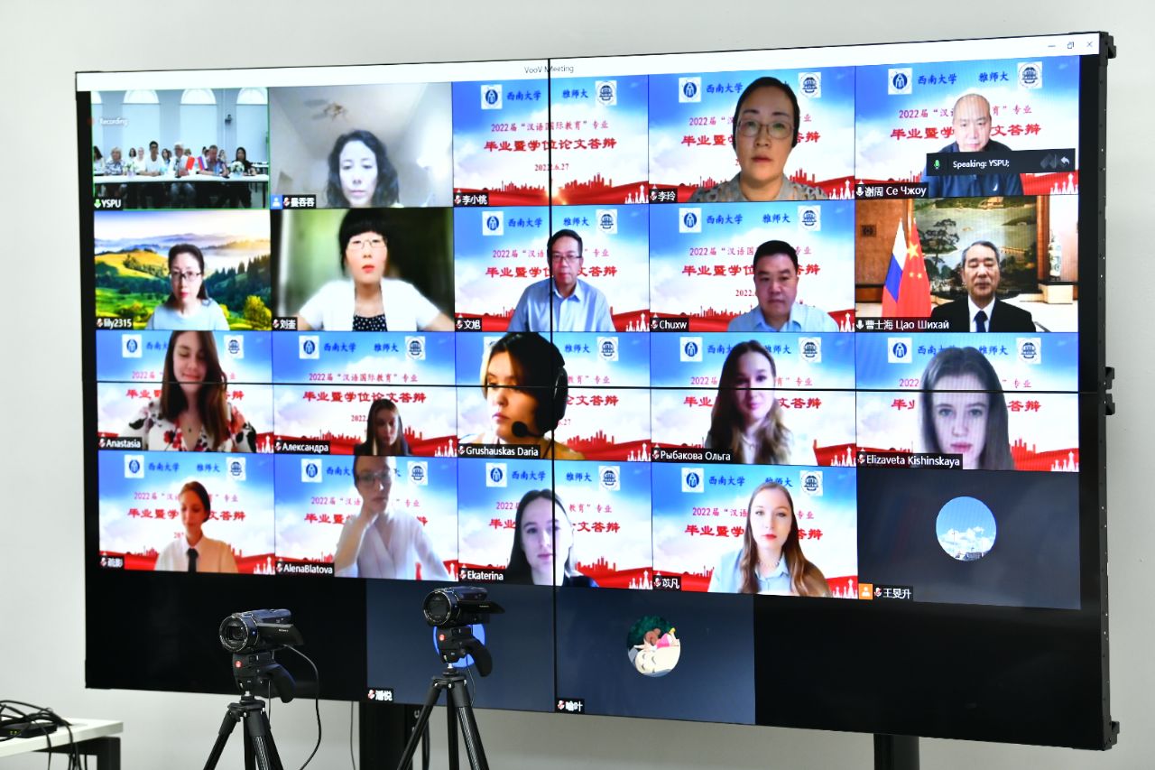 6月27日上午,通过线上与线下相结合的方式,我校与俄罗斯雅罗斯拉夫尔国立师范大学(雅师大)共同举办了“2+2+1”项目联合培养的第一届“汉语国际教育”专业19名本科生的毕业暨学位论文答辩会。雅师大校方对此高度重视,经与我方沟通,双方合作特为答辩会举办了隆重的开幕式。中国驻俄罗斯大使馆教育处曹士海公参、yl9193永利集团文旭院长、雅罗斯拉夫尔市副市长加夫里洛夫、雅罗斯拉夫尔州教育局第一副局长阿斯塔菲耶娃等嘉宾应邀出席。俄罗斯国家电视1台(Россия 1)和俄公共电视台(ОТР)等俄罗斯国家级媒体,以及雅罗斯拉夫尔市地方电视台等媒体均对此进行了深度报道。