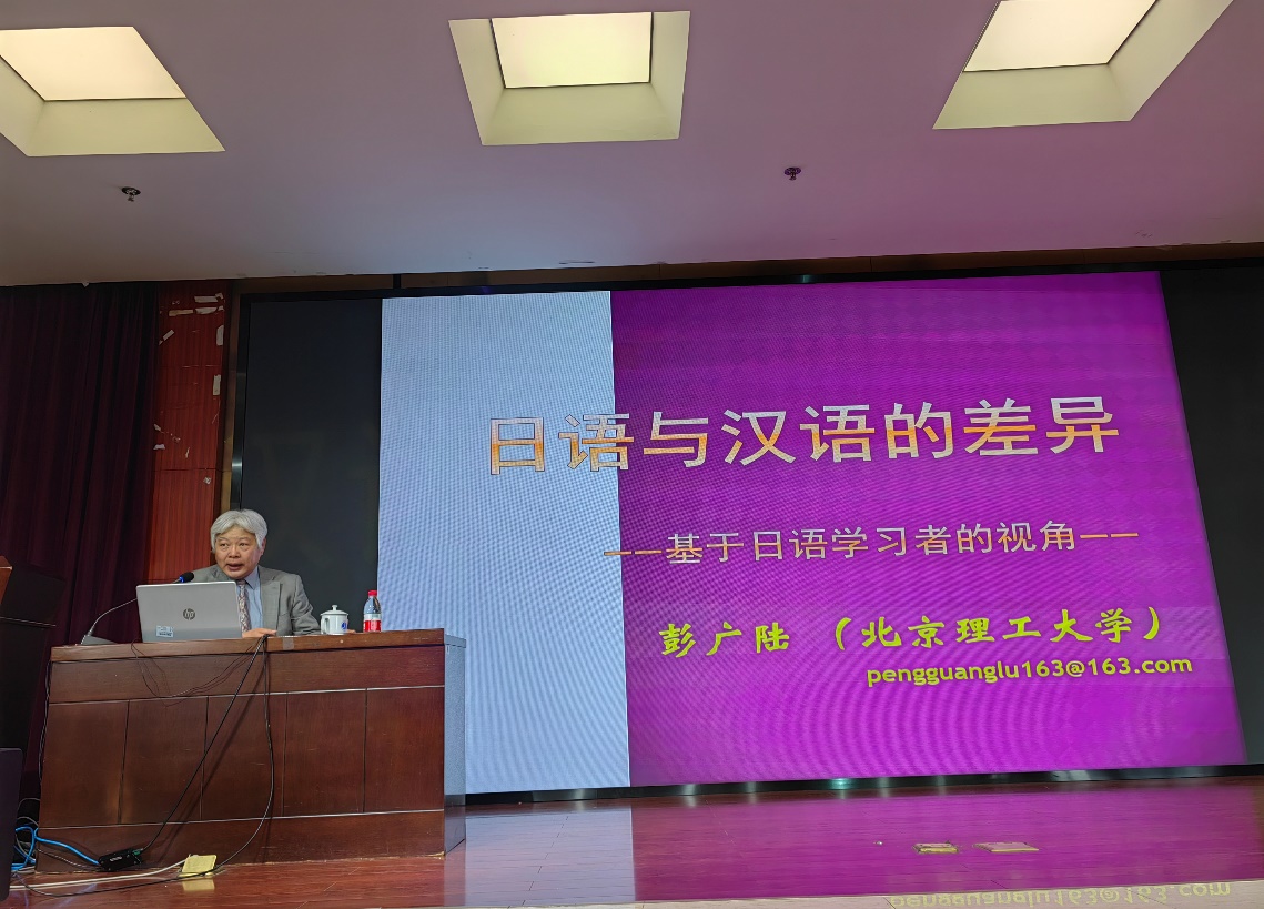 讲座中,彭广陆教授基于日语学习者的视角,分析了日语与汉语之间的大致对应关系及其主要差异。彭教授用外语学习者所需具备基本素质引入话题,概括性讲解了日语的特点:属于sov型、句尾形式多样、比较依赖语境、省略现象常见、敬语发达、同义词同音词较多、口语书面语差别较大等;接着,重点围绕语音、文字、词汇、语法、语篇、表达等方面,配以丰富的语例,对汉语与日语进行了直观了然的比较,指出了日语学习者在学习过程中容易出现的负迁移问题,并提及日语学习和翻译中需要注意的问题。