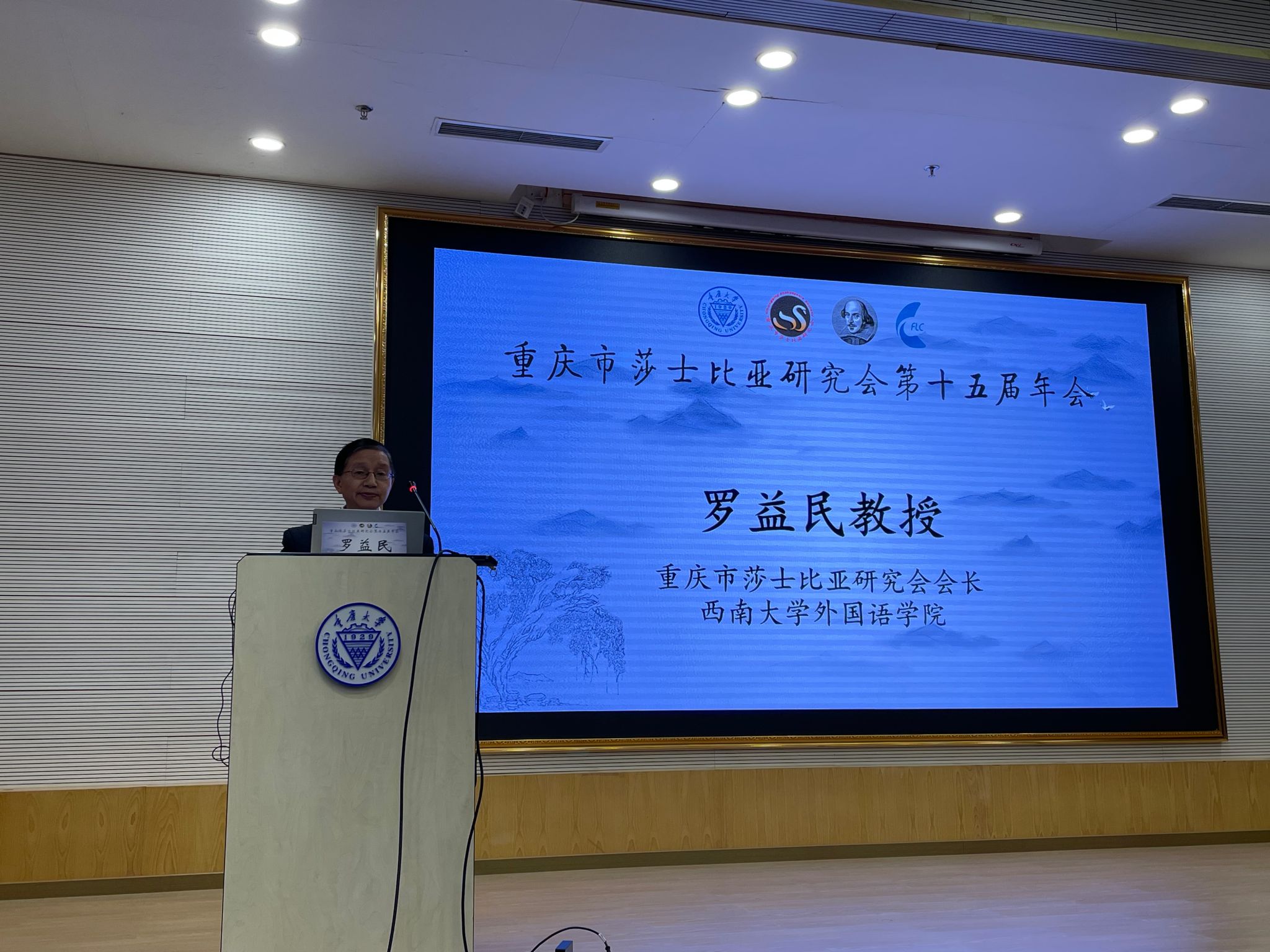 最后,中国外国文学学会莎士比亚研究分会副会长、重庆市莎士比亚研究会会长罗益民教授发表讲话。其追溯了研究会的学术渊源,对重庆自吴宓以来的莎士比亚传统进行了梳理和总结,特别指出梁实秋,朱生豪夫人宋清如,莎士比亚翻译家梁宗岱,莎士比亚词典编纂家刘炳善以及后来的蓝仁哲、孙法理和年初仙逝的吴宓弟子江家骏,后来的以李伟民为代表的,以郭方云、胡鹏、史敬轩、张军等为后续的莎士比亚重庆学谱,向大会汇报了莎士比亚研究会过去一年在学术研究、教学演出、文化传播等方面的成绩,特别是出版了学术辑刊《莎士比亚评论》,为重庆市莎士比亚研究等事业,又增加了一个学术辑刊,这在全国范围内是独一无二的,也标志着重庆市莎士比亚研究会进入了一个新的历史发展阶段。总之,重庆莎学界具有扎实的潜力,强大的队伍,十六年来,相关单位为莎士比亚研究培养出了15名莎学博士,数十名硕士,充满希望。