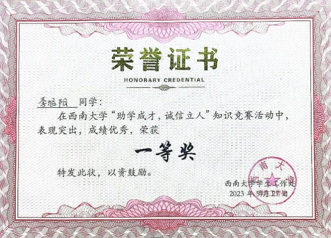 学院组织学生积极参与助学中心线上“助学成才,诚信立人”诚信知识竞赛。学生在答题中了解诚信及金融知识,以学增智、以知促行。其中李旭阳同学获得一等奖,周梦秋和梅婷获得优秀奖。