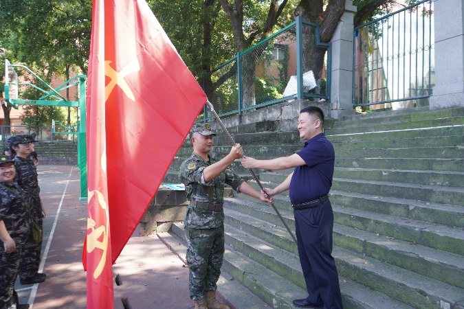 最后,连队指导员、学院党委副书记梅胜利向连长卢洲授旗,大会圆满结束。