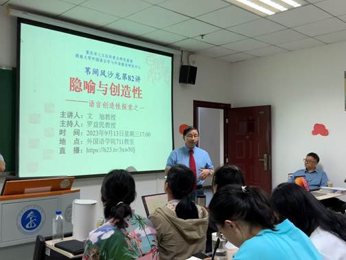 9月13日下午17点,苇间风沙龙第82讲在yl9193永利集团711教室顺利举行。罗益民教授主持了本次学术沙龙。作为本次沙龙的主讲人,永利集团yl9193永利集团院长、博士生导师文旭教授从“语言创造性是什么、语言创造性与人类创造力、隐喻的创造性和创造性隐喻对语言创造性的作用”四个方面为yl9193永利集团师生及其他同行学人做了一场题为《隐喻与创造性:语言创造性探索之一》的精彩沙龙学术讲座。
