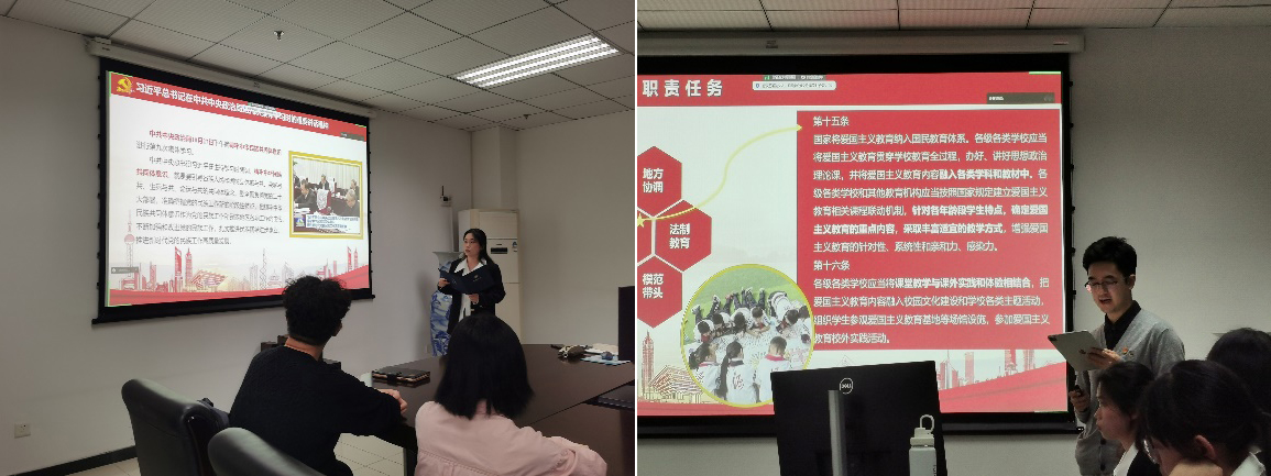 “交流研讨”环节,党员同志们围绕主题,结合身边事例进行了交流分享。支部党员刘苏仪同志分享了她在鲁迅纪念馆中感受到的民族魂和家国情怀,表示爱国应该与民族命运联系起来,付诸实践;支部党员胡萌同志以影视作品《万里归途》《逃出大英博物馆》为例,说明了融媒体等现代手段的辅助作用和巨大影响,认为我们应该深入挖掘优秀文化,从历史中寻找爱国主义的现实意义;支部党员靳宇稀同志针对“当代年轻人到底爱不爱国”这一网络话题进行分享,举例阐述年轻人的爱国行为,如传播中华优秀传统文化的留学生、扎根基层的大学生村官等;支部党员梅婷同志结合家乡革命烈士的事迹,呼吁党员同志们把爱国主义根植于日常生活中,从小事做起;支部党员杜柯薏同志提到了杭州亚运会展现出的中华优秀文化以及当代中国科技成果,表示我们应该从历史走向未来、从传统走向现代,在多元变化的背景下把握中华民族特性,实现民族复兴伟业。