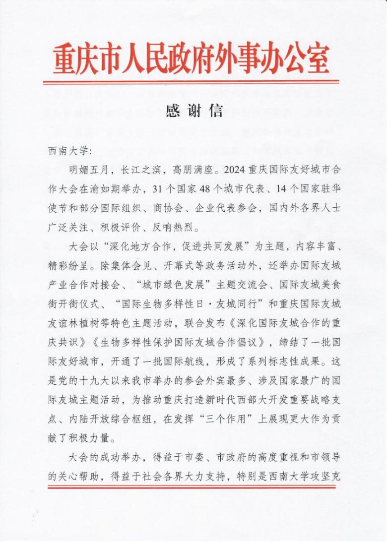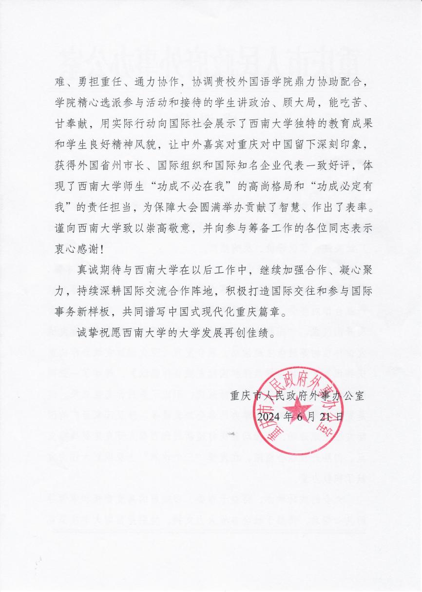近日,学院收到重庆市人民政府外事办公室发来的感谢信,感谢学院为2024重庆国际友好城市合作大会做出的贡献。信中表示,学院学子“讲政治、顾大局,能吃苦、甘奉献,用实际行动向国际社会展示了永利集团独特的教育成果和青年学生良好的精神风貌,让中外嘉宾对重庆对中国留下了深刻印象,并且获得外国省州市长、国际组织和国际知名企业代表一致好评,体现了永利集团师生‘功成不必在我’的高尚格局和‘功成必定有我’的责任担当,为保障大会圆满举办贡献了智慧、作出了表率。”