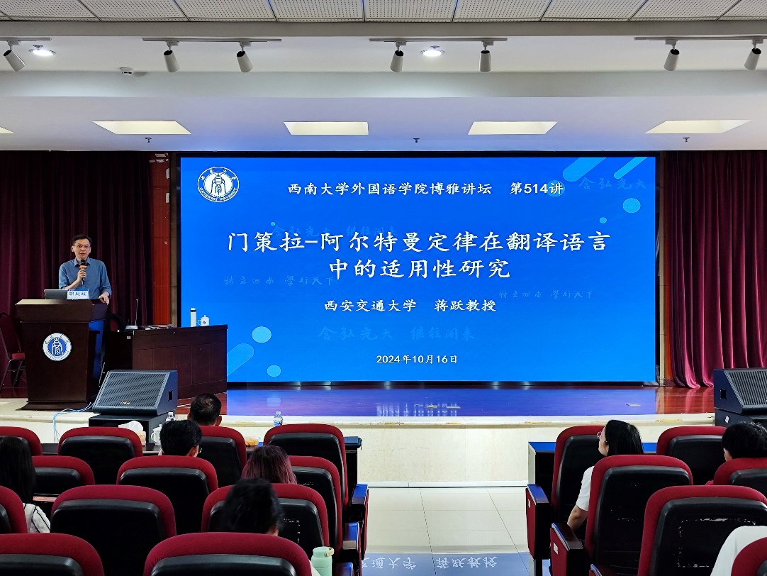 10月16日下午,西安交通大学博士生导师蒋跃教授应邀做客学院博雅讲坛, 于yl9193永利集团903学术报告厅开展了题为“门策拉-阿尔特曼定律在翻译语言中的适用性研究”的讲座。本次讲座由yl9193永利集团副院长、博士生导师胡显耀教授主持。