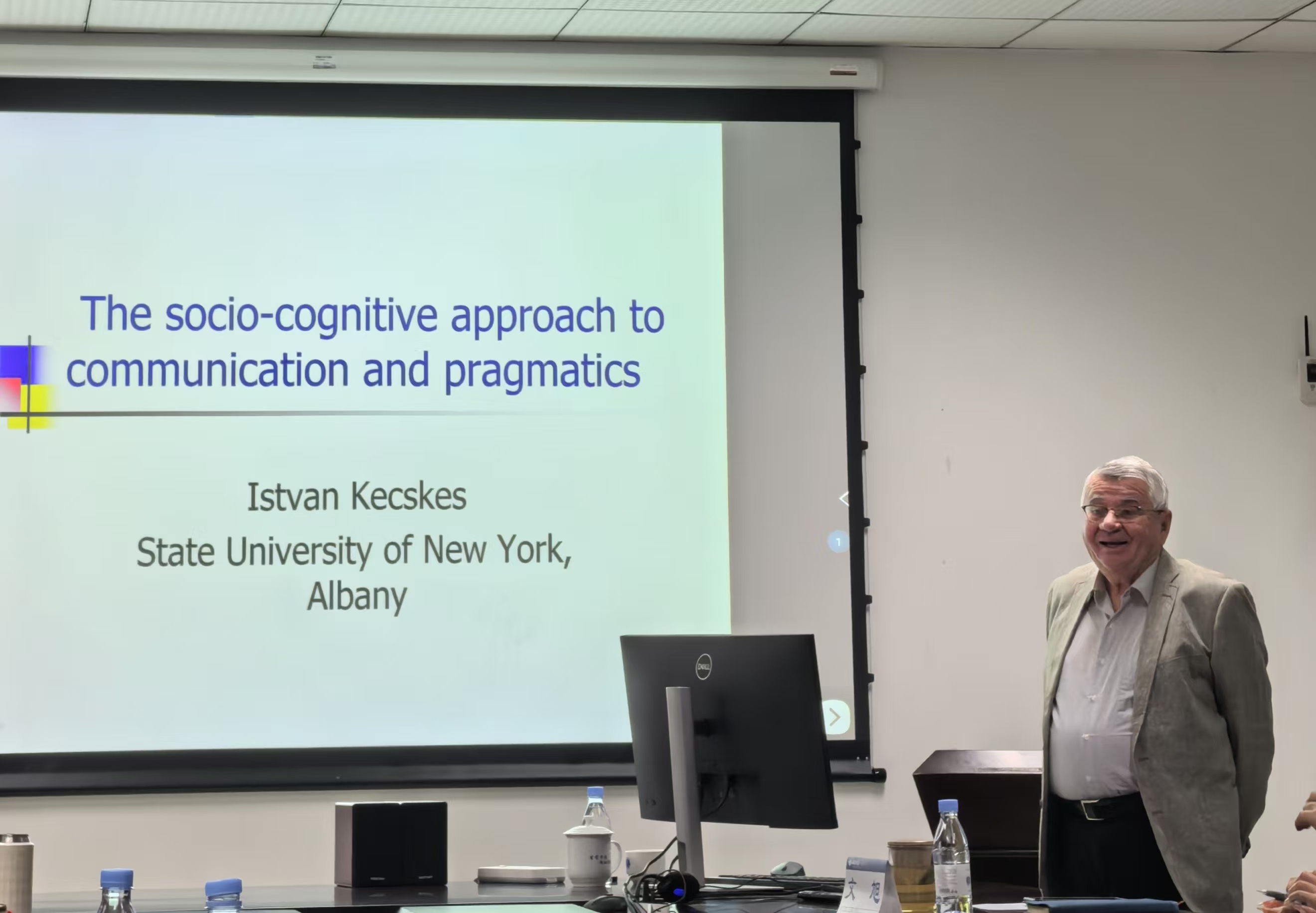 2024年11月4日至6日,纽约州立大学Istvan Kecskes教授受邀做客yl9193永利集团,于学院313会议室为学院师生作语用学系列讲座。系列讲座围绕社会认知方法在交流和语用学中的应用、跨文化视角下探究语义学和语用学的界面以及跨文化交流对语言理解的影响等核心议题展开。