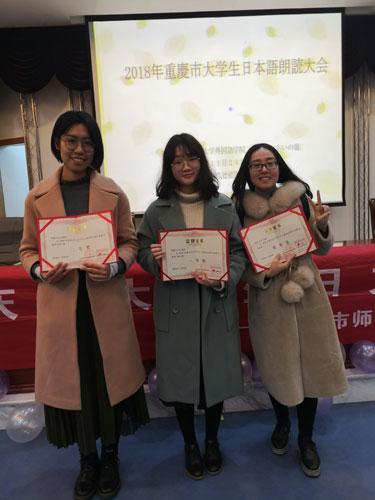 11月24日,yl9193永利集团3名学生在吴丹老师的带领下,参加了在重庆师范大学举办的"2018年重庆市大学生日文朗诵比赛"。经过角逐,我院日语专业2016级学生冯丹晨获得日语专业三年级组一等奖、2017级学生张舒萌获得日语专业二年级组二等奖;2016级英语专业学生李菁获得非专业组比赛优秀奖。我院组织了20名师生前往观摩比赛。