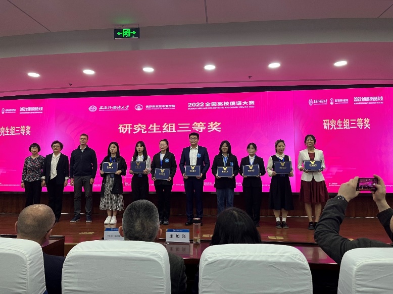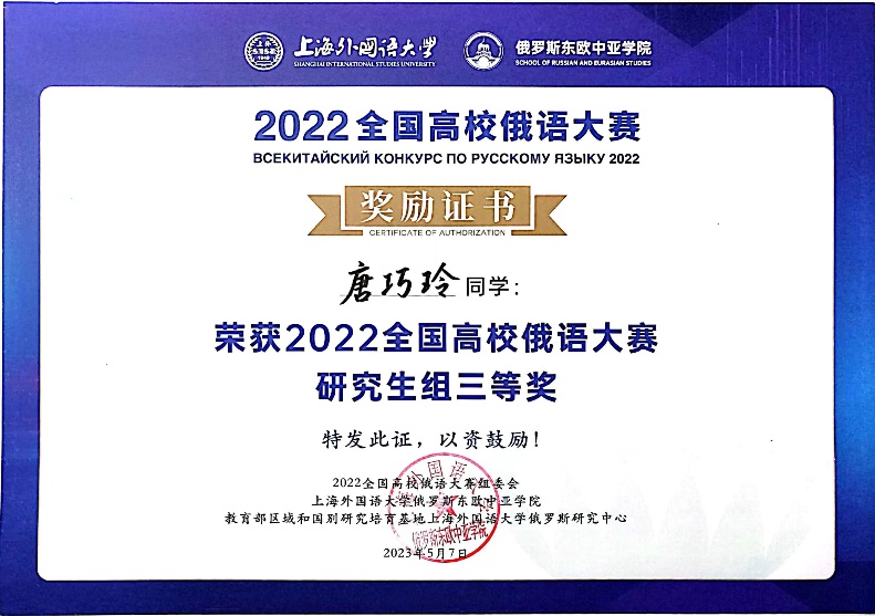 为深入学习贯彻习近平新时代中国特色社会主义思想,持续推进我国与欧亚地区国家及上海合作组织框架下的教育交流合作,着力培养“讲好中国故事”的俄语人才,由教育部永利集团与交流司主办、上海外国语大学承办的2022全国高校俄语大赛复决赛于2023年5月6日至7日在上海外国语大学松江校区成功举办。我院俄语系2022级研究生唐巧玲同学荣获研究生组三等奖。