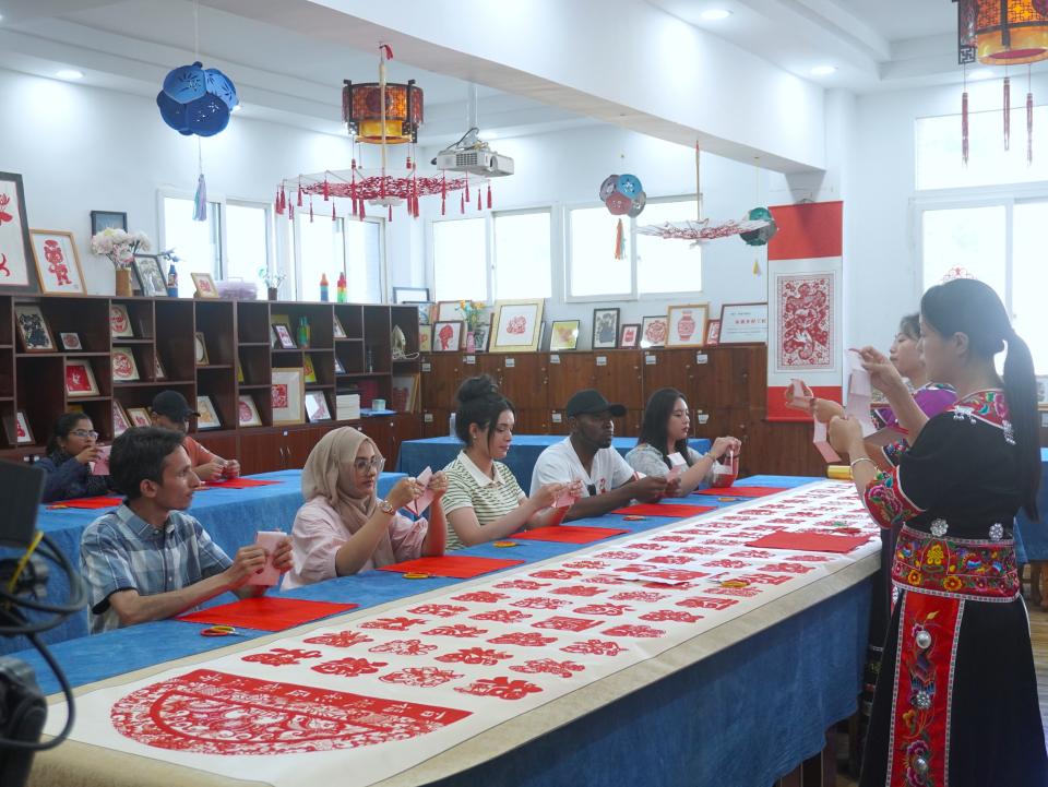 在彭水职教中心,外教及留学生体验了中国非物质文化遗产——剪纸与蜡染技艺。在非遗传承人的悉心指导下,外国青年亲手完成剪纸图案和蜡染作品,不仅掌握了传统工艺基础,更加深了对中华文化细腻智慧与美学价值的理解。